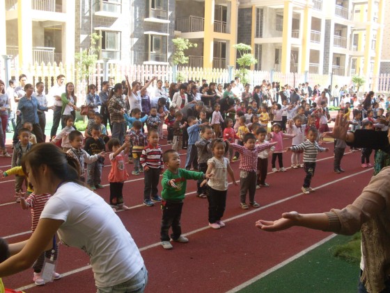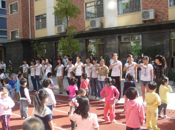 9月29日,在迪斯尼幼兒園、園外園幼稚園的操場(chǎng)上,響起了早操律動(dòng)音樂(lè),可愛(ài)的寶寶們?cè)诓賵?chǎng)上跟隨著老師們的步伐,蹦蹦跳跳起來(lái)。在老師的帶動(dòng)下,在場(chǎng)的家長(zhǎng)們也紛紛加入進(jìn)來(lái),和寶寶們一起又唱又跳。迪斯尼幼兒園的老師們表演了民族舞《天藍(lán)藍(lán)》,還進(jìn)行了古箏、個(gè)人舞的才藝表演,展示了幼兒園老師們朝氣蓬勃的精神面貌。園外園幼稚園的老師們也不甘示弱,在現(xiàn)場(chǎng)以特有的方式展現(xiàn)了幼兒園的承諾、愿景、文化。