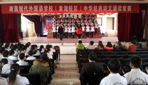 2013年1月29日下午,南昌現代外國語學校(象湖校區)在演藝廳舉行了中華經典詩誦讀比賽。全新的誦讀形式,訓練有素的朗誦水平,精美的舞臺設計,獨特的節目編排讓全校師生共享了一場視聽的饕餮盛宴。比賽朗誦的詩題材廣泛,既有中華經典的,也有現代的;既有歷代文豪的,也有領袖人物的。參賽選手所誦讀的中華經典詩文縱貫古今,氣勢磅礴,集中抒發了對祖國、對中華文化的熱愛之情,對如今生活的珍惜和贊頌之情。